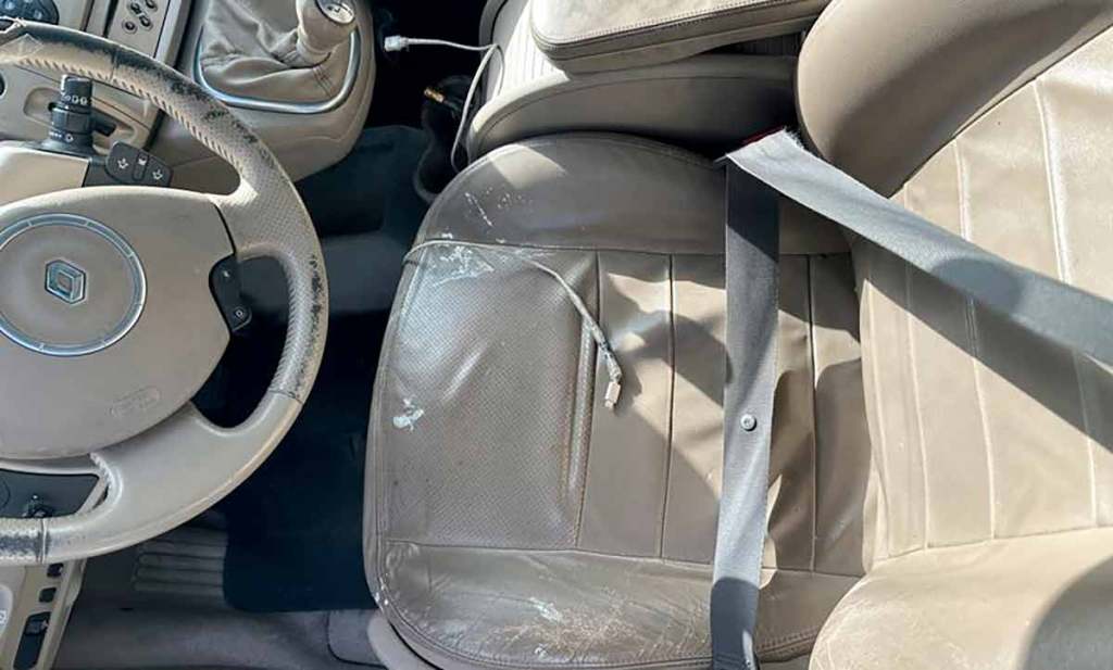 En finition haute, le Scénic recevait une jolie sellerie en cuir beige. Cela apportait un côté nettement plus chic à ce monospace. Une ambiance claire que l’on retrouve aussi sur la console centrale et le volant. Au fil des années, le cuir non entretenu a tendance à craqueler et surtout, à perdre son aspect clair. Le rendu devient alors vite crasseux d’apparence. Quant au volant, son revêtement part, apportant des touches de noir disgracieuses. Un intérieur clair entretenu, c’est beau. Mais là, ça vite souvent à l’horreur.