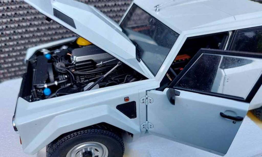 Il disposait alors d’un moteur V12 atmosphérique de 450 chevaux. Sa masse importante (2,7 tonne) engendrait une consommation énorme : plus de 30 litres aux 100 kilomètres. Autant dire que le Lamborghini LM002 est aujourd’hui un modèle très rare et que je ne m’attendais pas vraiment à découvrir ce gros bébé chez AUTOart. Sur ces premiers visuels, on remarque que la qualité de fabrication paraît bonne.