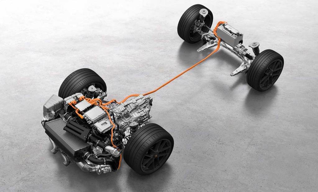 On trouve aussi deux moteurs électriques qui permettent d’atteindre la puissance totale de 541 chevaux et 610 Nm de couple, ce qui gommera sans difficulté les 50 kg d’embonpoint. Le premier moteur électrique prend place au sein même de la boîte automatique PDK à double embrayage et 8 rapports. Le second, de 15 chevaux, est situé dans le turbocompresseur pour améliorer les temps de réponse à bas régime. Ce même type de fonctionnement s’apparente à ce que propose Toyota ou encore Renault avec sa gamme « Full Hybrid ». Il n’y a donc pas de recharge à effectuer. La batterie a une capacité brute de 1.9 kWh et une tension de 400 V. Cela n’autorise donc pas de fonctionnement en mode 100 % électrique ; ce n’est pas le but recherché ici avec cette branche T-Hybrid.