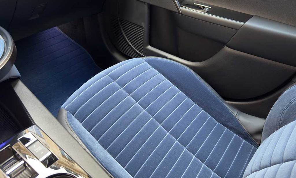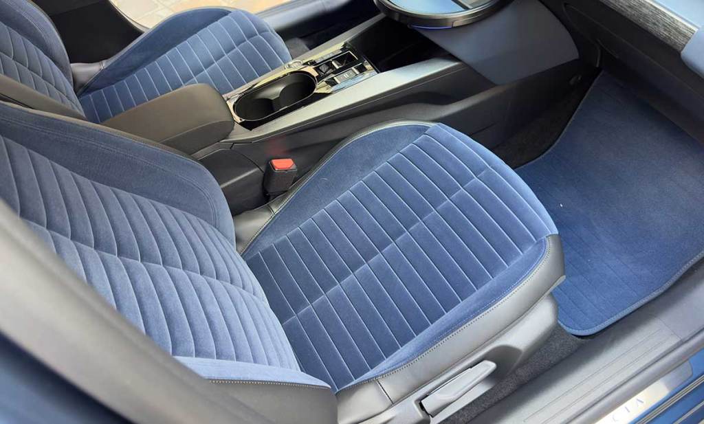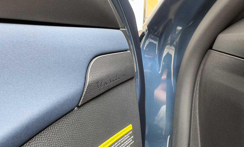 Dans l’ensemble, c’est donc un bilan plutôt positif qui se dégage de cet intérieur. Mention spéciale aussi pour le revêtement des contre-portes. C’est un matériau assez indescriptible qui offre un visuel très lisse et un toucher souple. Il faudra voir comment cela vieillit dans le temps mais c’est très agréable. Cela sera bien sûr l’apanage des versions hautes. La finition LX n’est pas en reste. Malgré sa sellerie noire, elle offre une multitude de détails couleur bronze. L’habitacle a été conçu avec un minimum de 50 % de pièces recyclées.