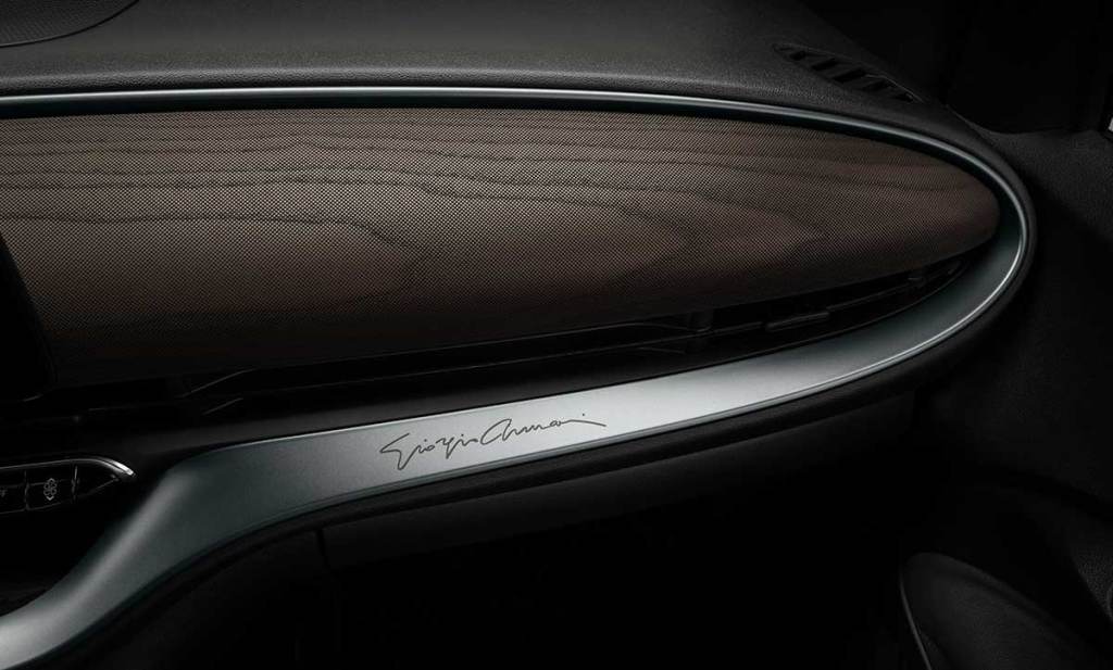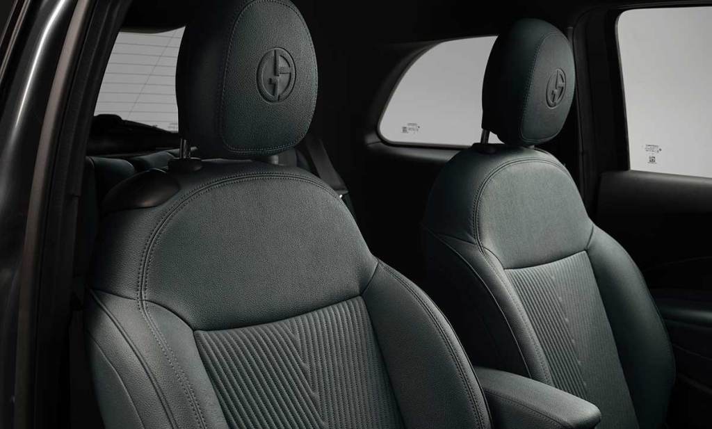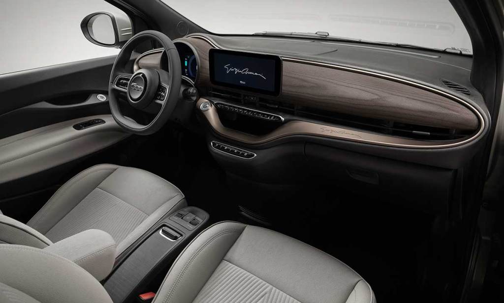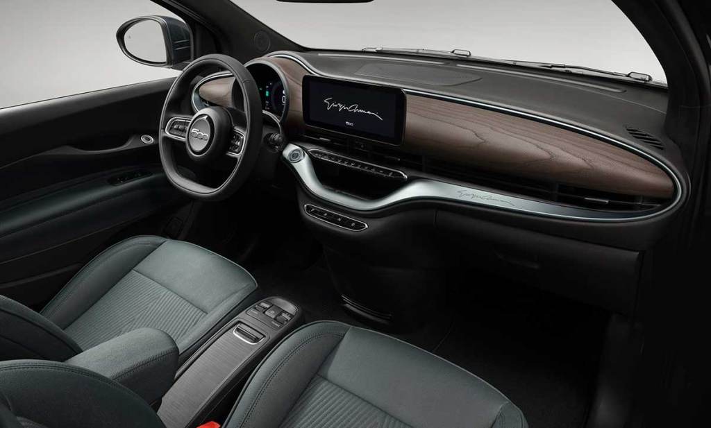 Mais ce n’est pas tout ! La Fiat 500e Giorgio Armani inaugure également deux nouvelles couleurs de carrosserie. Vous pourrez choisir un joli vert foncé métallisé ou bien le Ceramique Greige. Pour cette dernière, on pourrait penser à un gris (mais la marque n’en propose plus) mais il s’agit en réalité d’un mélange entre gris et beige. Ces deux teintes sont très agréables à l’œil avec un visuel chic. Sur les inserts, en dessous des vitres de custode, on peut aussi remarquer la signature de Giorgio Armani. Là encore, c’est très distingué. Cette série limitée n’en fait pas trop, elle préfère se concentrer sur des éléments bien distinctifs, communs à l’image des deux entreprises, qui veulent cultiver design, style et artisanat. D’ailleurs, Fiat et Giorgio Armani avaient déjà collaboré il y a quelques années.