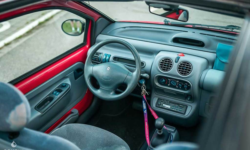 Rares sont les Twingo dans un tel état de conservation. La baie moteur semble plutôt propre et il y a eu de nombreux frais d’entretien récents, comme la rotule de direction ou encore la climatisation. La voiture dispose bien sûr d’un contrôle technique en cours de validité et de toute sa documentation d’époque, ce qui est rare. Côté châssis, cela semble assez propre. Certains éléments semblent avoir été couverts de blackson mais cela semble localisé.