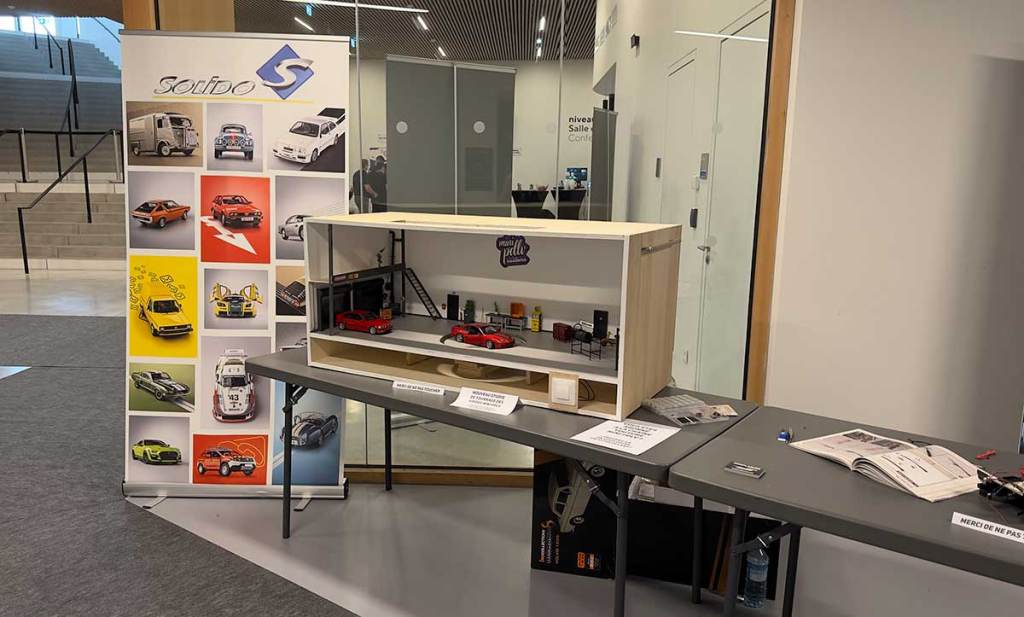 Notre stand comprenait trois parties principales. Sur la gauche, nous avions notre nouveau studio de tournage miniature. Un élément que nous avons dévoilé en exclusivité à l’occasion du salon. Forcément, la période a été très chargée et malgré notre bonne volonté, c’est un diorama toujours en travaux que nous avons exposé. Dedans, nous avions disposé plusieurs miniatures 1/18, avec notamment le plateau tournant. Juste derrière, Solido nous avait sympathiquement envoyé un grand Roll-Up mettant en avant quelques modèles récents dévoilés par ce grand fabricant.
