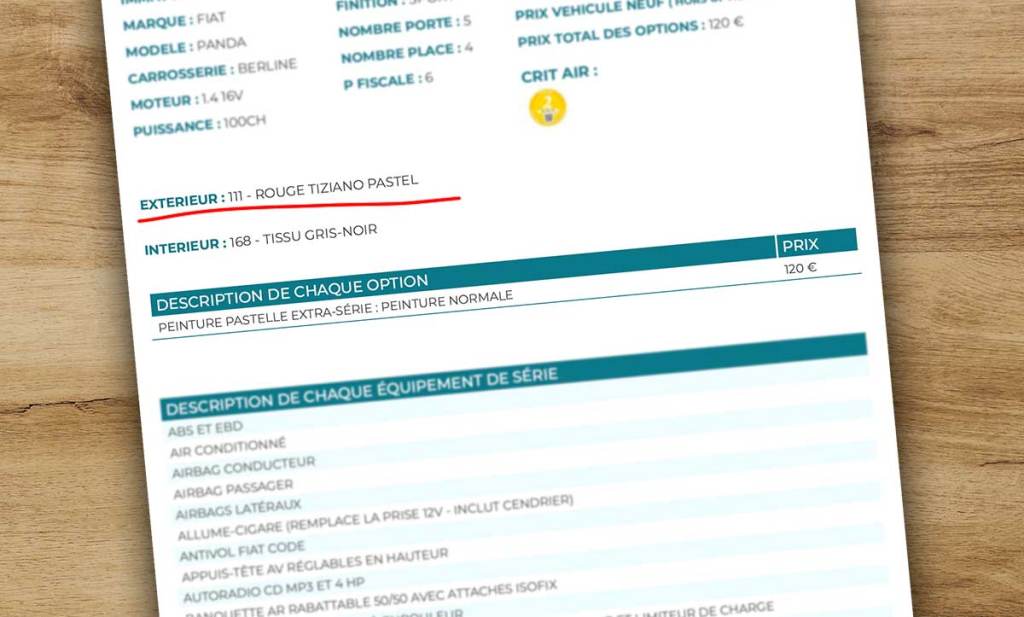 Quitte à payer pour avoir l’information, je vous conseille tout autant de commander un rapport MecaVIN, qui vous donnera certes le code couleur de votre voiture, mais aussi pas mal d’informations qui peuvent vous intéresser, comme la finition exacte de votre auto, ses équipements de série et ses options ou encore le prix d’achat neuf à l’époque.