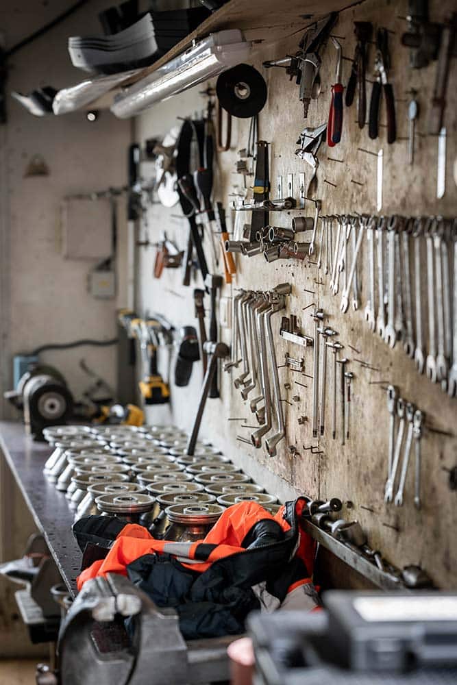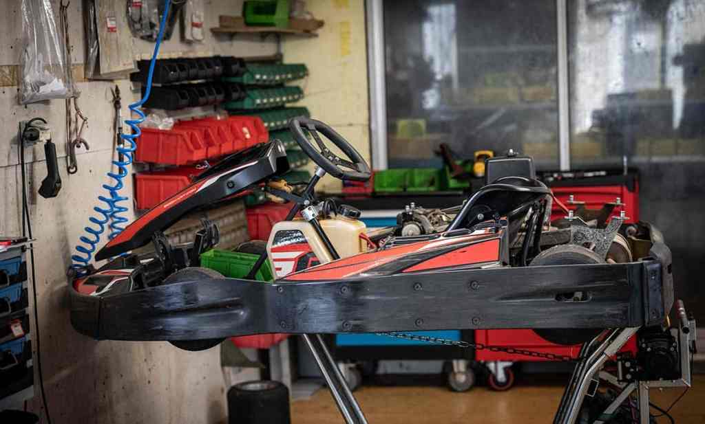 Aussi, l’atelier dispose d’un pont qui permet de travailler plus efficacement sur les karts. Sans surprise, le principal consommable, ce sont les pneus. Puisque le circuit comprend davantage de virages à droite, le pneu gauche s’use plus rapidement que le droit. On découvre alors un immense stock de pneus d’avance prêts à être montés. Théo doit aussi remplacer les éléments et parfois intervenir sur le moteur ou les parties périphériques lorsque c’est nécessaire.
