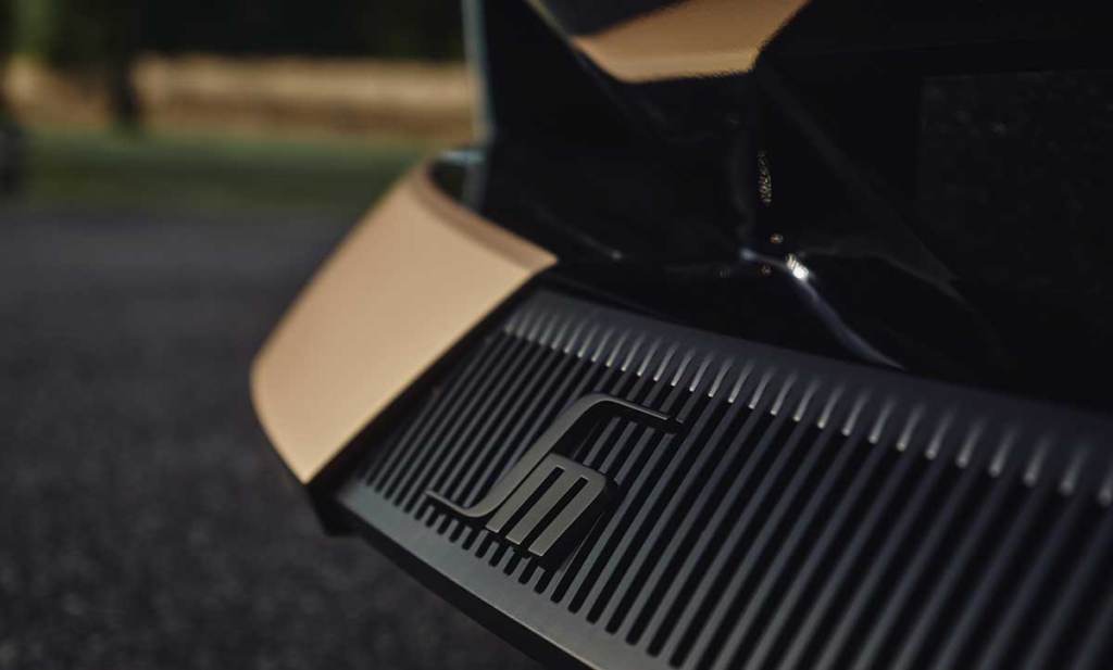Au niveau de l’avant, la SM Tribute n’a pas de calandre, comme son aïeule ! Toutefois, pas de masque transparent qui incorpore la plaque d’immatriculation au centre des optiques. La marque a toutefois repris un joli masque qui accueille les optiques. Ces dernières, à LED, ont un design très raffiné et contemporain. L’ensemble s’étend vers le centre, avec une stylisation du logo DS. C’est assez intéressant. La signature lumineuse, avec des feux de jours qui s’étendent vers le haut et le bas, donneront sans doute aussi de précieux indices sur les futures productions. Ce masque noir épais et très sophistiqué, à l’avant, pourrait aussi trouver écho sur des modèles à venir. D’ailleurs, DS Automobiles pourrait pencher vers le néo-rétro dans un futur plus ou moins proche…