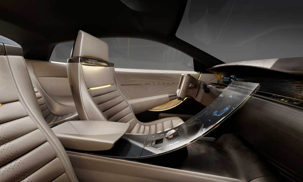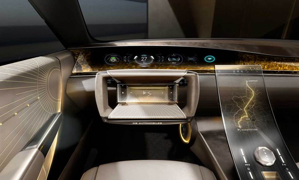 L’intérieur est sans doute la partie la plus impressionnante. DS Automobiles renoue avec des sièges qui ont l’air très moelleux, avec un design un peu à l’ancienne tandis que la planche de bord, très étirée, accueillie une immense dalle qui centralise toute l’instrumentation, en projetant les données. Le volant arbore une forme rectangulaire et percée, avec une partie centrale très sophistiquée. Le cuir est gravé au laser, dessinant des formes élégantes. Quant à la console centrale, c’est une superbe pièce en verre sur laquelle les informations sont projetées. Cela donne un côté très futuriste. Des jeux d’éclairage prennent aussi place. On retrouvera aussi différents gimmicks qui rappellent la Citroën SM !