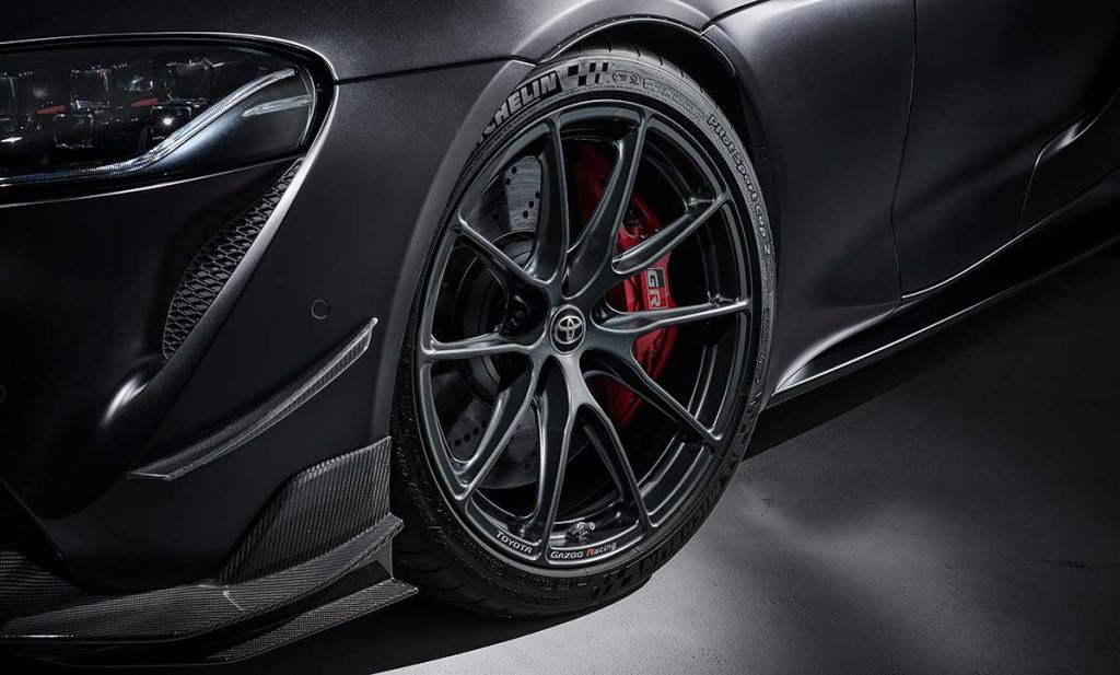 Pour aller encore plus encore plus loin, Toyota propose la GR Supra Final Edition. Celle-ci s’inspire ouvertement du modèle GT4 en proposant une hausse de la puissance à 435 chevaux. Mais surtout, elle se démarque par un design beaucoup plus affirmé. Elle reçoit une peinture de carrosserie exclusive, à savoir le Noir Graphite, une teinte mat. On trouve aussi des jantes allégées de 19 pouces à l’avant et 20 pouces à l’arrière, montées sur pneus Michelin Pilot Sport Cup 2 à haute adhérence, élargis de 10 millimètres. Des freins Brembo de 480 millimètres sont installés à l’avant, avec des flexibles en acier inoxydable, toujours dans cette optique d’accroître les performances. Elle adopte également un kit carrosserie assez imposant, un aileron plus volumineux et un spoiler avant, des appendices aérodynamiques… Tout cela contribue à largement dynamiser encore la Supra !