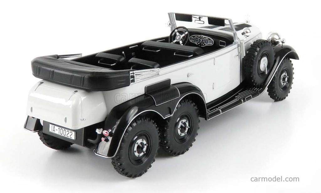 Dès la fin des années ’20, Mercedes-Benz a commencé à développer des voitures en vue d’équiper la Wehrmacht. Après un premier échec, le modèle G4 sera finalement retenu en 1934. Une dizaine d’exemplaires sera finalement livrée, avec des améliorations apportées tout au long de la carrière du modèle. Cette grande berline découvrable à 6 roues souffrait de nombreux maux, à commencer par une masse extrêmement élevée et une vitesse de pointe très limitée. Annoncée depuis cinq ans déjà, la réplique 1/18 de cette Mercedes G4 de type W31 s’apprête enfin à être commercialisée par MCG. Les précommandes sont déjà ouvertes auprès des revendeurs, comme Carmodel. Vous aurez le choix entre un coloris gris ou noir, pour un prix d’environ 70 € l’unité. C’est très correct !