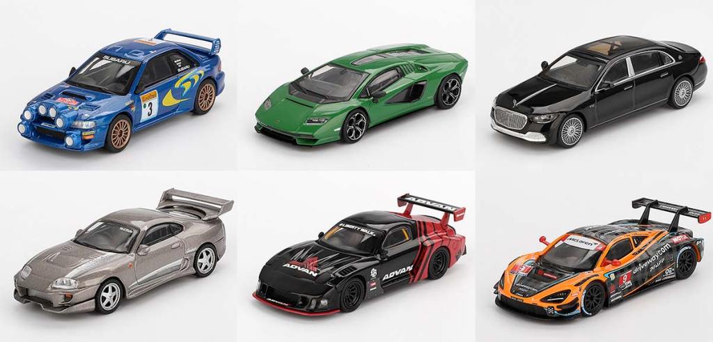Une fois encore, Mini GT parviendra à mettre tout le monde d’accord en proposant des modèles issus de différents horizons. La plus sage de la sélection, si je puis dire, dispose tout de même d’un puissant moteur V12. Il s’agit de l’élégance Mercedes-Maybach S 680 qui revient cette fois dans une livrée noire, avec l’intérieur assorti. Une configuration très classique mais qui a l’avantage de s’intégrer facilement dans une collection et/ou un diorama. Ensuite, on trouvera trois japonaises. Il y a tout d’abord la Subaru Impreza WRC98 n°3 qui termina en troisième position le rallye de Monte Carlo en 1998. Elle fut pilotée par Colin McRae, accompagné de son copilote Grist Nicky. On trouvera aussi l’impressionnante Mazda RX-7 Super Silhouette de Liberty Walk, en livrée Advan. À peine moins dans la démesure, la Toyota Supra Mk4 s’offre le kit VeilSide et se pare d’une jolie livrée beige.