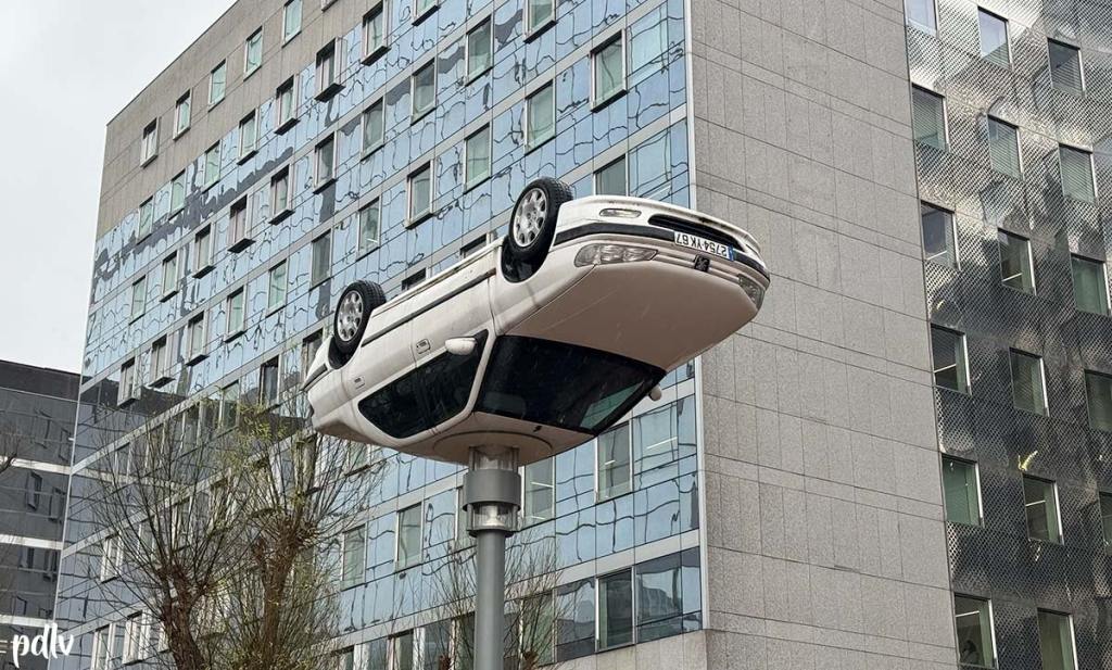 Il y a quelques jours, nous étions conviés à un événement qui se tenait à La Défense Arena. Sur notre route, nous avons eu la surprise d’arriver face à une Peugeot 406, érigée à l’envers sur un poteau, à la manière d’un lampadaire. Une installation curieuse qui a forcément retenu notre attention. Nous avons eu l’envie d’en savoir plus et de vous partager nos photographies de cette œuvre d’art surprenante, qui prend place dans le quartier Valmy, à la Défense, face à un immeuble. Réalisée par l’artiste lyonnais Benedetto Bufalino a été élaborée pour l’édition 2019 des Extatiques. Elle a finalement été installée de manière définitive à La Défense en milieu d’année 2020. Avis aux amateurs d’art : cet artiste travaille beaucoup sur l’univers automobile…