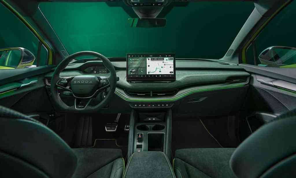 Entre un Skoda Elroq en finition Sportline et cette nouvelle variante RS, les apports sont très limités. L’essentiel tient en ces nouveaux sièges plus enveloppants, avec une sellerie suédine parée de surpiqûres vertes. La dotation progresse aussi légèrement, avec les sièges et volant chauffants ou encore la fonction massage intégrée (mais uniquement pour le conducteur). L’instrumentation numérique comprend une dalle de 5,3 pouces est toujours de la partie, tout comme l’écran central de 13,0 pouces. Naturellement, les graphismes ont été adaptés pour renforcer le côté sportif de cette version RS. Côté équipements, il faudra toujours passer par la case des options pour avoir le système audio Cantan avec 12 haut-parleurs.