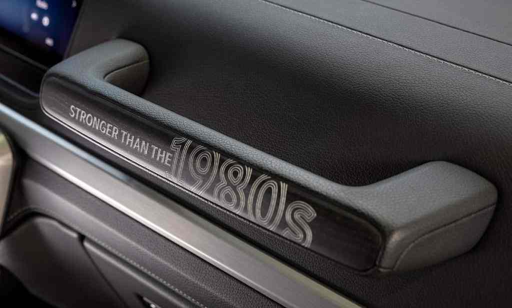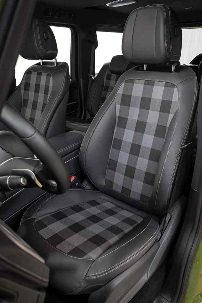 À l’intérieur du Mercedes Classe G Stronger Than The 1980, nous retrouvons naturellement la présentation de l’actuelle génération, qui comprend notamment de larges écrans. Toutefois, la symbolique se porte sur la sellerie qui intègre un revêtement en tissu gris tourterelle, assorti à un motif à carreaux. Sur la poignée de maintien, face au passager, nous retrouvons aussi la dénomination de cette série limitée. Divers détails intéressants sont aussi disposés, comme l’insigne « Schöckl Proved » sur les montants B, qui fait écho à la piste d’essai où le Classe G accomplit ses essais techniques depuis 1979. Des modifications savamment dosés qui prennent du sens : nous sommes sur un modèle hommage, sur lequel on retrouve logiquement les équipements modernes, tant à l’intérieur qu’à l’extérieur.