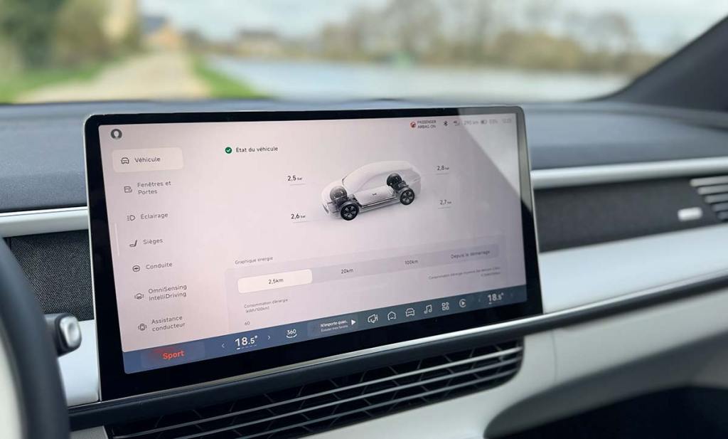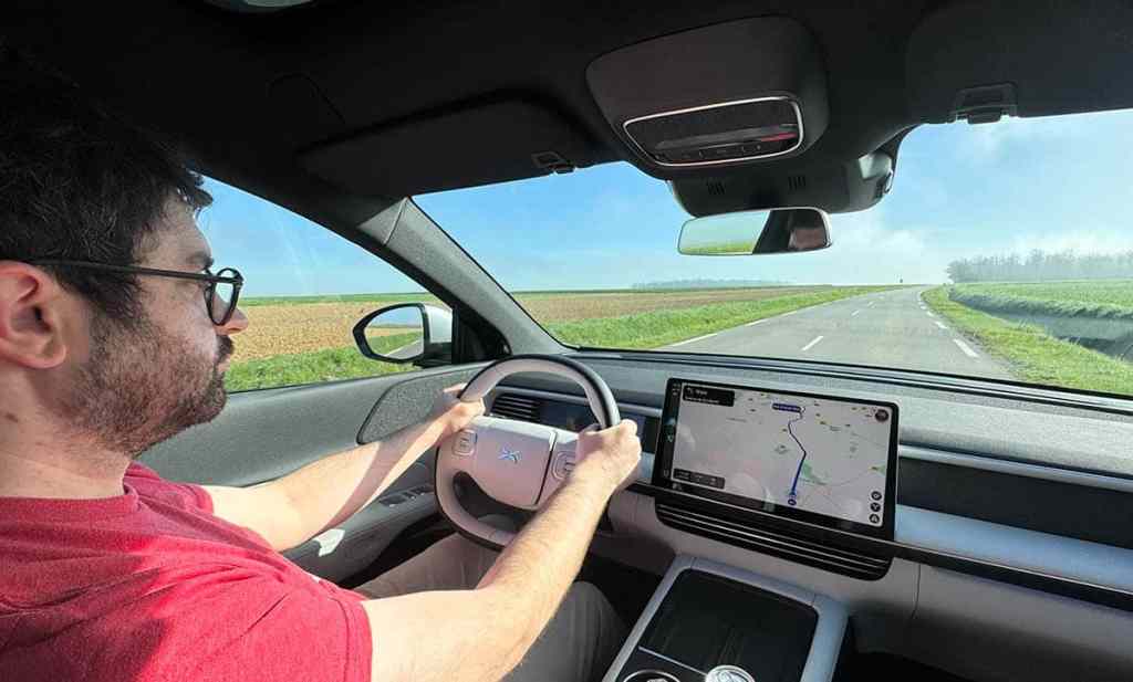 Je vous conseille donc de rester sur le mode Sport ou bien même de créer votre propre mode de conduite, depuis le mode Individuel, qui vous donne accès à tous les réglages possibles de la voiture. C’est assez agréable. Côté aides à la conduite, nous avons la conduite autonome de niveau 2. Cela permet même de gérer un dépassement sur route ou sur autoroute quand les conditions le permettent. Le tout est encore un peu brut mais c’est prometteur. En revanche, le stationnement automatisé est une merveille. Dans un parking, il suffit d’enclencher la marche arrière pour que l’écran central reconstitue les alentours. Les places disponibles apparaissent en bleu. Il suffit de toucher celle de votre choix. La G6 se met alors à manœuvrer en totale autonomie jusqu’à l’arrêt total. C’est bluffant de précision !