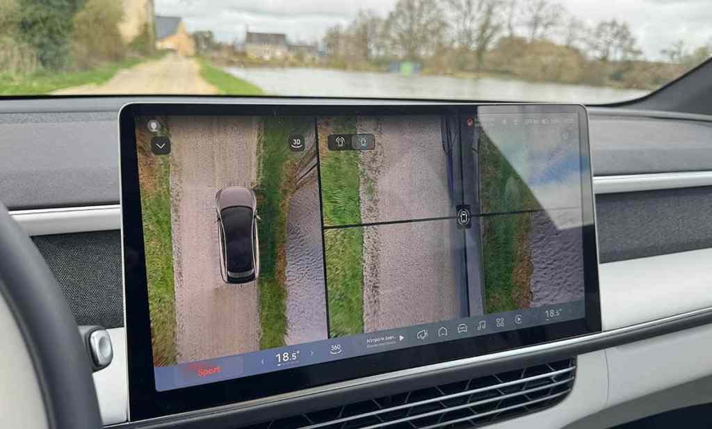 D’ailleurs, le XPeng G6 dispose d’une architecture à 800 Volts, ce qui diminue grandement les temps de recharge ! Il repose aussi sur la plateforme SEPA 2.0, qui comprend une technologie cell-to-body. Concrètement, la batterie fait partie intégrante du châssis, en renforçant sa rigidité. Cela permet un gain de poids tout en augmentant la rigidité. Dès les premiers mètres, j’ai été plutôt convaincu par les prestations. Les aides ne sont pas trop envahissantes et les nombreuses caméras rendent la circulation plus sûre, en permettant une anticipation maximale. Le gabarit du G6 est assez impressionnant mais ces dimensions s’appréhendent assez facilement. Les caméras réparties tout autour de la voiture sont idéales et permettent de reconstituer une vue à 360°.