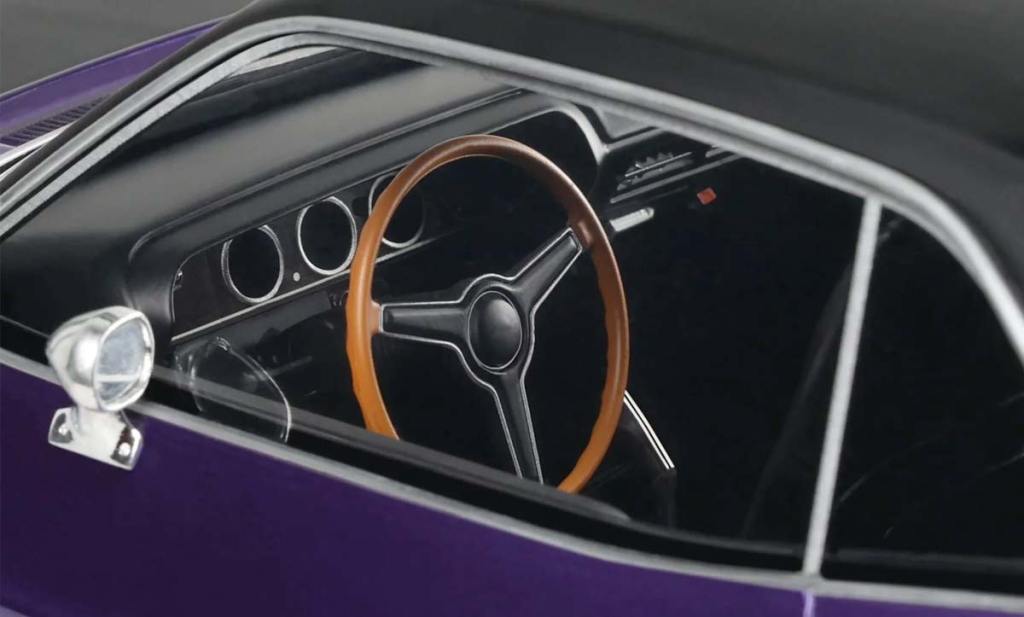 Régulièrement, OttOmobile propose des modèles vendus en dehors des clubs. Ces miniatures peuvent être achetées directement et sont généralement en tirage assez limités. La Dodge Challenger R/T, c’est un mythe roulant. Elle incarne une forme de démesure, avec des lignes très étirées et de gros moteurs qui n’ont rien de raisonnable ! La Challenger sera d’ailleurs la star de plusieurs films et séries, à commencer par General Lee, la hero car de Shérif, fais-moi peur. Pour cette nouvelle miniature au 1/12, nous sommes donc sur un modèle de grande taille, qui s’étend sur près de 41 centimètres de long. La peinture violette semble superbement appliquée et l’on retrouve tous les appendices propres au modèle restylé de 1970. Il y a notamment ce masque de capot qui permet d’aérer davantage le gros moteur V8 de 380 chevaux.