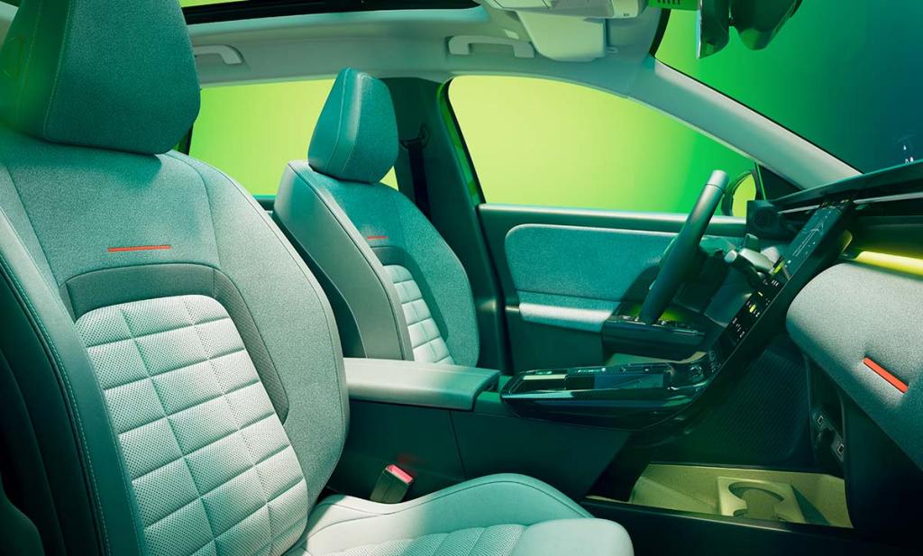 Sur ces quelques visuels, on peut apprécier les efforts faits sur l’ambiance intérieur. Des tons assez clairs qui offrent une ambiance accueillante. La planche de bord qui s’étend visuellement sur les contre-portes, c’est une bonne chose pour structurer l’ensemble. Il en est de même pour l’écran central qui se prolonge en partie basse. Cela crée une belle unité. Le conducteur dispose d’une instrumentation numérique de 10 % et même d’un affichage tête haute de série. Les finitions supérieures auront une surface d’affichage plus vaste mais la marque n’en dit pas davantage pour le moment.