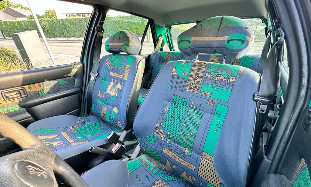 Quand on accède à bord, on comprend mieux la légitimité du nom « Cartoon ». Au niveau de la planche de bord, on trouve un insert Cartoon et des compteurs à fond vert. C’est du plus bel effet ! Toutefois, le compteur droit, de grande taille, n’indique pas les tours-minutes : c’est simplement une horloge. Les passages de vitesses se font à l’oreille, uniquement. La dotation est assez basique mais on trouve tout de même un autoradio. En revanche, la sellerie Bugs & Bugsy est mémorable et spécifique. Les sièges sont à dominante bleue et ils arborent des motifs stylisés comprenant des silhouettes de voitures de la marque, des motifs et textures, divers dessins et des panneaux indiquant des directions, notamment Paris. Ils sont surmontés d’appuie-têtes en forme de voiture que vous ne trouverez nul part ailleurs !