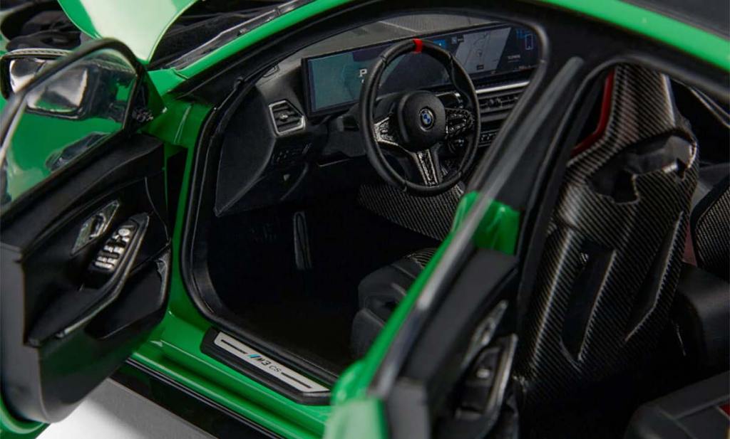 Lorsque l’on regarde cette jolie miniature de la BMW M3 CS de 2024, on remarque que le rendu est plutôt réussi dans l’ensemble. L’application de la teinte Signal Green semble très réussie. C’est une couleur qui offre de beaux reflets, avec une belle intensité. On découvre aussi qu’il est possible d’ouvrir le capot moteur, les quatre portes ainsi que le coffre. L’intérieur est d’ailleurs très bien modélisé. Les sièges baquets sont réussis, tout comme la planche de bord. L’application de la texture façon fibre de carbone est bonne, avec le respect du sens des fibres. Les écrans numériques sont aussi bien schématisés et vous accéderez aux différentes commandes. Le tout bénéficie d’une bonne rigueur d’ensemble. Certains ajustements pourraient être encore plus précis mais nous sommes déjà sur une très belle qualité.