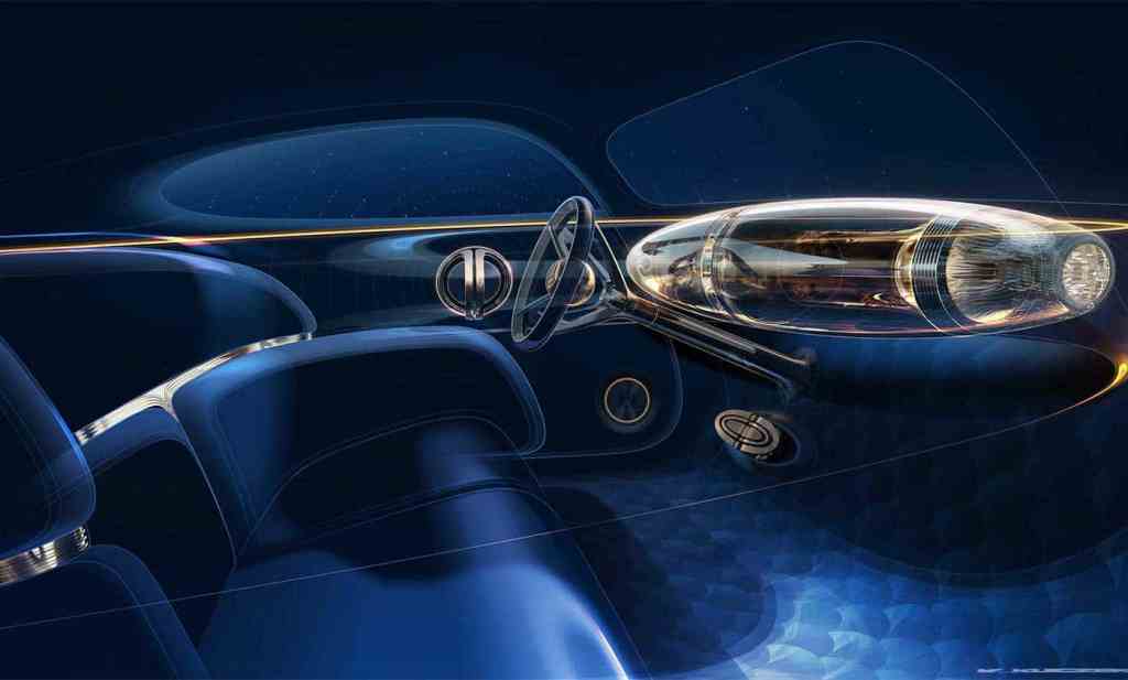 Les designers ont eu carte blanche pour élaborer un concept-car de coupé qui rendrait hommage aux plus beaux modèles de la marque, avec une ambiance art déco largement perceptible. Le tout s’accompagne pourtant de traits volontairement épurés. Les poignées de porte sont affleurantes, les traits sont minimalistes et la ligne de caisse est épurée, dénuée de superflu.