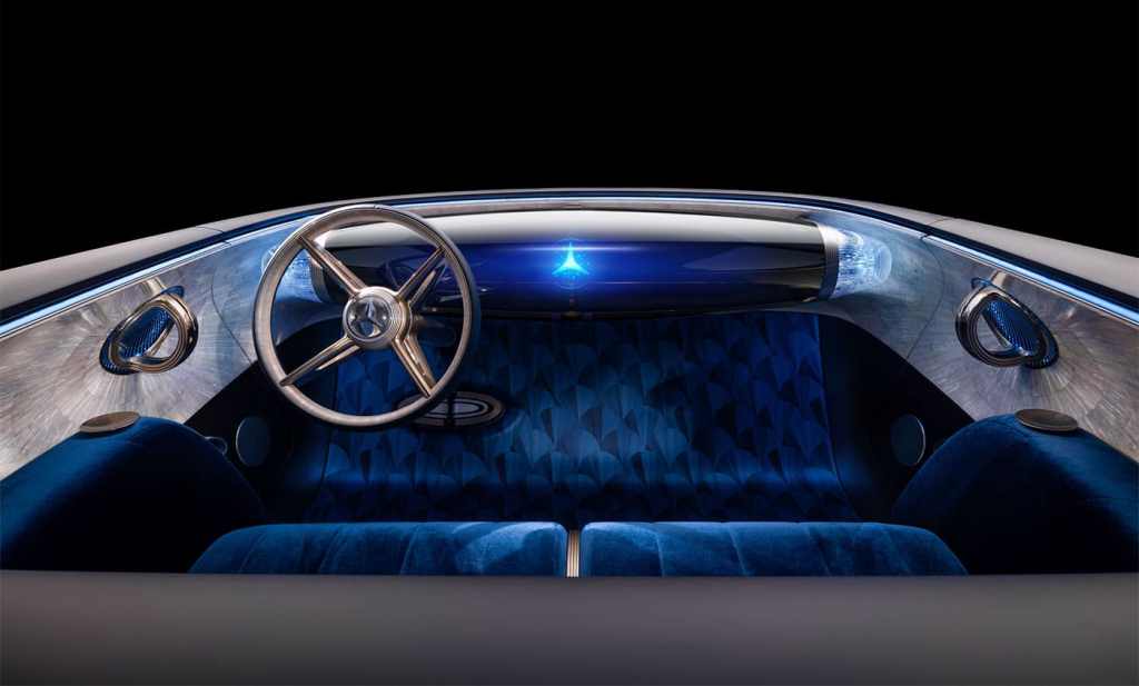 Découvrons maintenant l’intérieur de la Mercedes-Benz Vision Iconic. Et là, il se passe des choses. La marque à l’étoile propose un univers hors du temps, guidé par le courant art déco du siècle dernier. Pensé comme un cocon, l’intérieur comprend des matériaux bruts mais aussi un tableau de bord transporté nommé Zeppelin, faisant écho aux dirigeables d’époque.