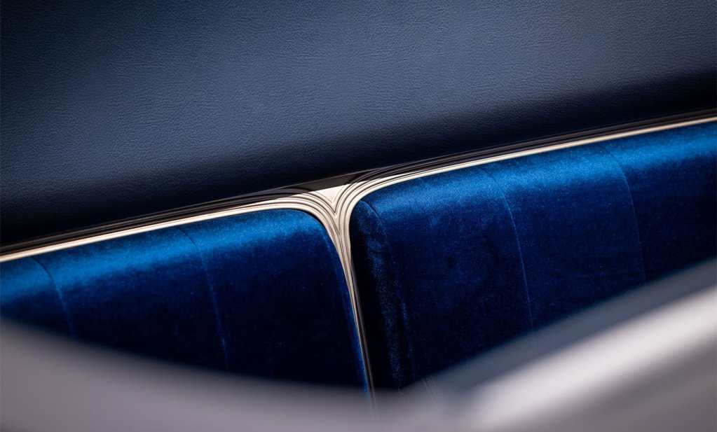 Le conducteur et son passager voyagent confortablement sur une banquette enveloppante, vêtue d’un velours bleu du plus bel effet. Le sol s’habille d’un somptueux revêtement en marqueterie de paille. C’est une technique ancestrale qui donne un rendu haut de gamme. Elle aussi se pare de bleu, pour donner une belle unité.