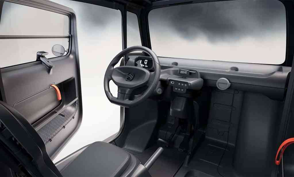 La Citroën Ami Dark Side reprend l’intérieur des versions « classique ». On retrouve un seul et même modèle de portière, avec une ouverture antagoniste pour celle du conducteur. Pas de siège spécifique mais toujours ces mêmes assises assez peu confortables, légèrement moussées. Quelques touches de gris sont de la partie, avec quelques accessoires pratiques, comme les filets de rangement, le crochet de sac placé face au passager et au niveau des surpiqûres des tapis de sol. Il y a aussi les rangements sur la partie supérieure de la planche de bord. Le toit panoramique est toujours de la partie.
