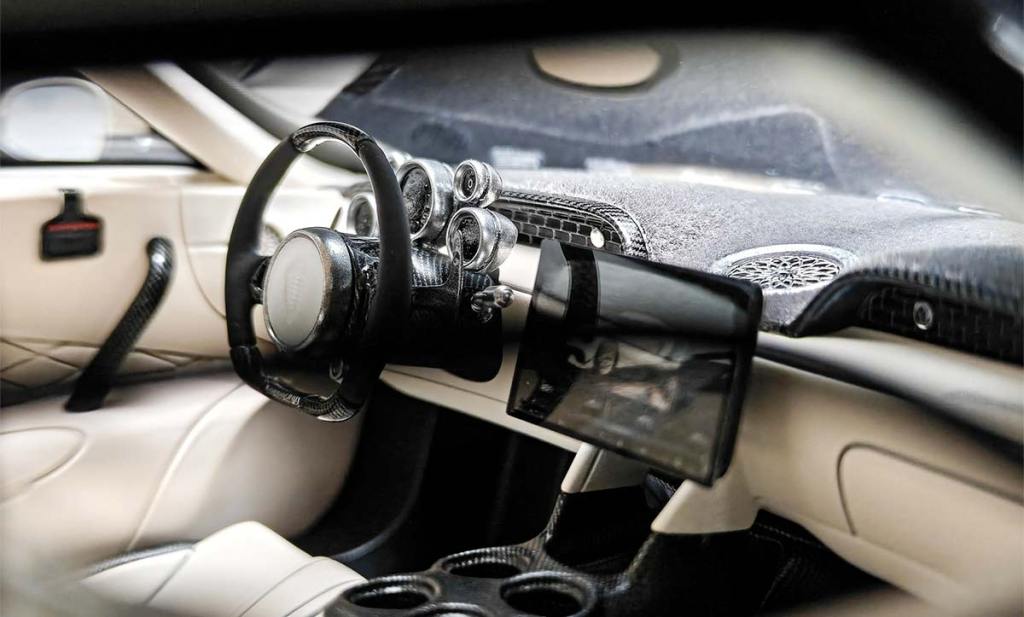 Venons-en à cette réplique 1/18. FrontiArt fait partie des fabricants de voitures miniatures les plus talentueux du marché. Les prix de vente assez élevés permettent d’atteindre des standards assez exceptionnels. Pour ce modèle de couleur Champagne, on découvre une reproduction en résine, sans défaut. Chaque détail a fait l’objet d’une attention particulière. Le rendu de la fibre de carbone est parfaitement réaliste, tout comme les ajustements d’ouvrants (pas fonctionnels). À l’intérieur, cette même rigueur s’observe dans le choix des matériaux, les textures, les ajustements… C’est bien simple, il n’y a rien à reprocher…