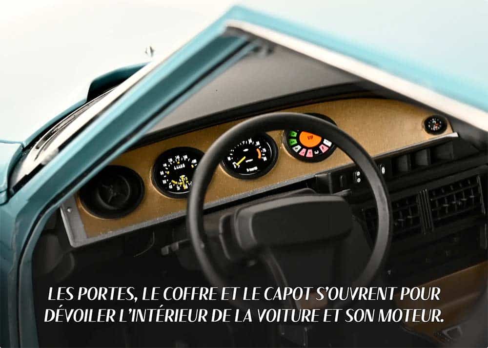 Une fois assemblée, cette Citroën SM à l’échelle 1/8 mesure 61 centimètres de long, pour 23 de large et 17 de haut. Le modèle arbore une jolie carrosserie bleue et dispose d’une télécommande qui donne accès à quelques fonctions. Vous pourrez émettre des bruits d’accélération, faire fonctionner le klaxon mais aussi allumer les optiques. La miniature dispose de toutes les parties ouvrantes et d’un intérieur détaillé. Les fonds de compteurs sont également imprimés. À titre personnel, je reste assez perplexe quant à la finition intérieure qui me semble légère pour cette grande échelle. À l’inverse, la baie moteur est plutôt bien rapportée.