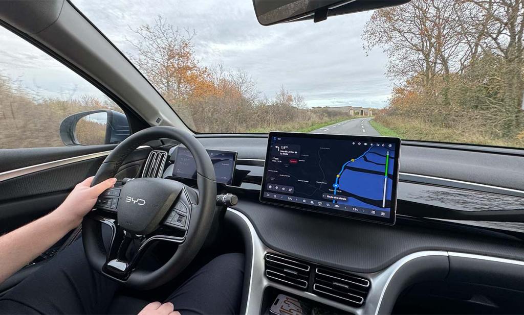 Fidèle à ses habitudes, BYD cherche à avoir une interface épurée. La majorité des boutons physiques se situe sur le volant ou sur la partie basse de la console centrale, au niveau du sélecteur. Le feeling de ces boutons est très agréable. Les autres sont désormais tactiles et prennent place sur le grand écran tactile central de 12,8 pouces. D’une belle résolution, il peut accueillir Apple CarPlay et Android Auto sans fil.