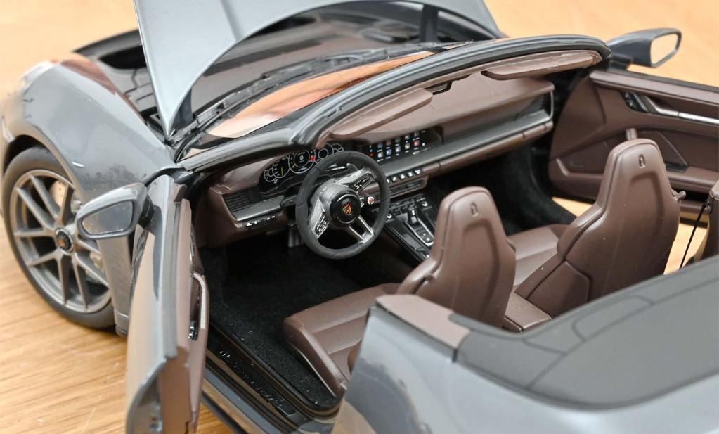Norev a été très réactive pour être la première marque à proposer la Porsche 911 (992) restylée à l’échelle 1/18. Après les versions coupé et targa, place désormais au cabriolet. Pour cette première variante colorée, Norev édite directement une série limitée. Pour cette première version, la configuration est assez surprenante. Nous sommes sur une version GTS, équipée du nouveau moteur hybride qui délivre 541 chevaux. On retrouve les jantes avec écrou de serrage central et des étriers de frein noir. Côté couleur, c’est le classique Slate Grey Neo qui habille ce cabriolet. Pour l’intérieur, Norev a sélectionné le très bel intérieur en cuir Club Brun Truffe.