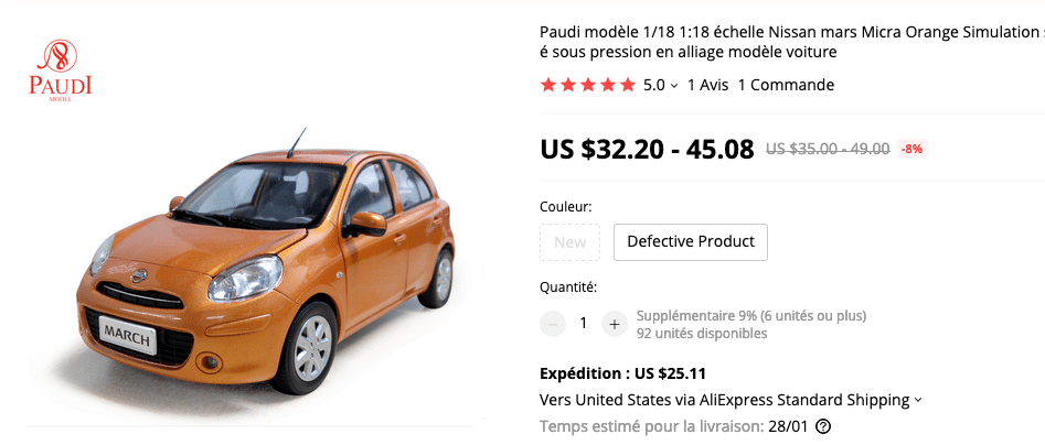 Cette place de marché fonctionne comme la plupart des sites internet traditionnels. Lorsque l’on fait une recherche, on aboutit sur plusieurs résultats. Par expérience, nous vous conseillons de ne pas vous arrêter au premier résultat de recherche mais de poursuivre vos investigations. Régulièrement, des vendeurs baissent artificiellement leurs prix en gonflant les frais de port. Des pratiques interdites en France mais qui demeurent fréquentes sur AliExpress, même pour les voitures miniatures (dont les Paudi). Toujours est-il que AliExpress demeure un site où les bonnes affaires existent.