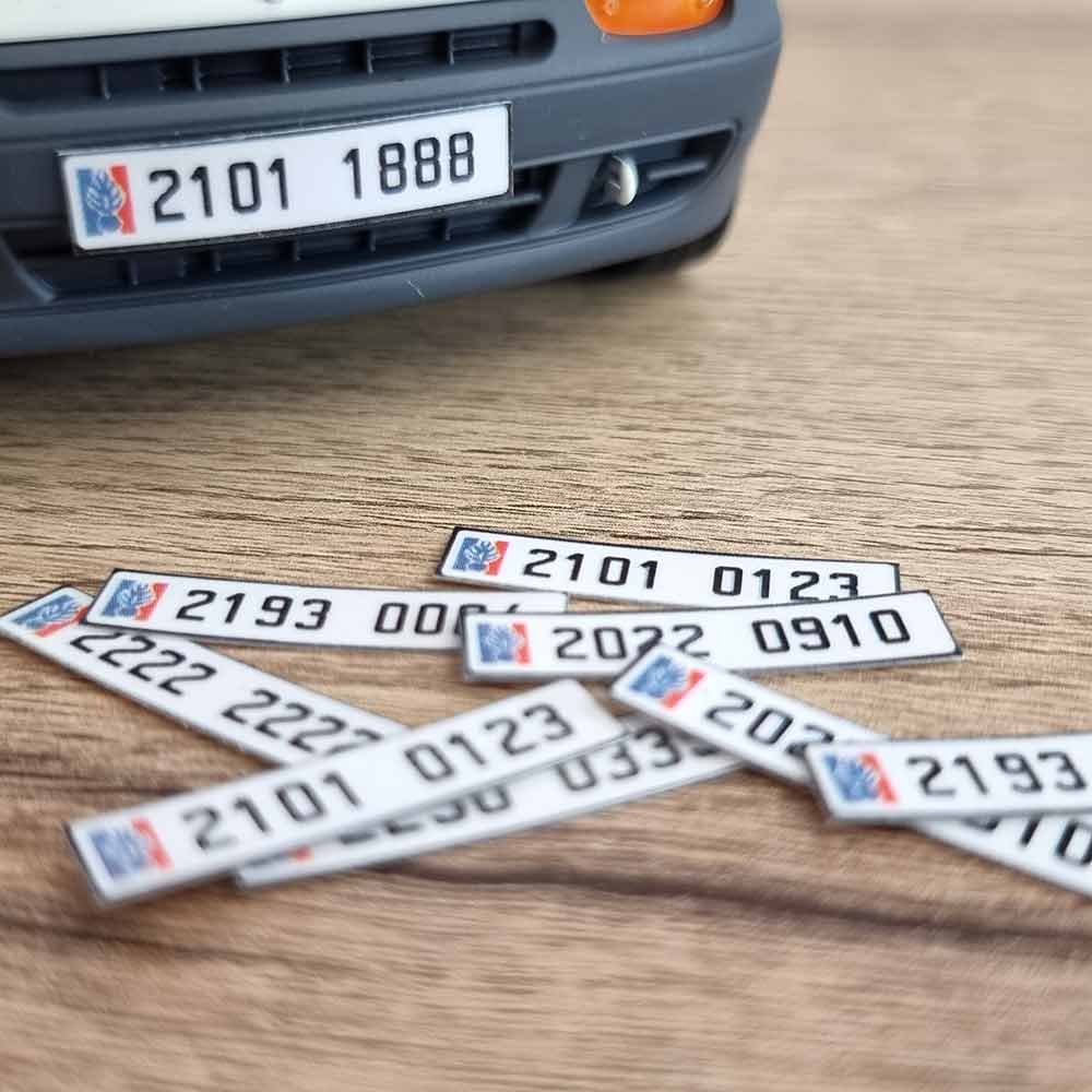 Vous souhaitez augmenter le réalisme d’une voiture de gendarmerie à l’échelle 1/18 ? Voici nos plaques d’immatriculation personnalisables. Des plaques de qualité, qu’il vous suffira de coller sur vos miniatures. Ci-dessous, vous trouverez la procédure pour commander, dès maintenant, vos sets de plaques au meilleur prix.